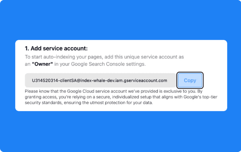 Connect websites to Indexwhale by adding a service account to your domain in GSC.